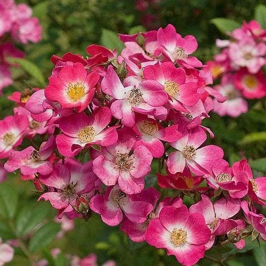 Положительные особенности сорта Роза цветет крупными кистями карминно-красных немахровых цветков с белым центром.